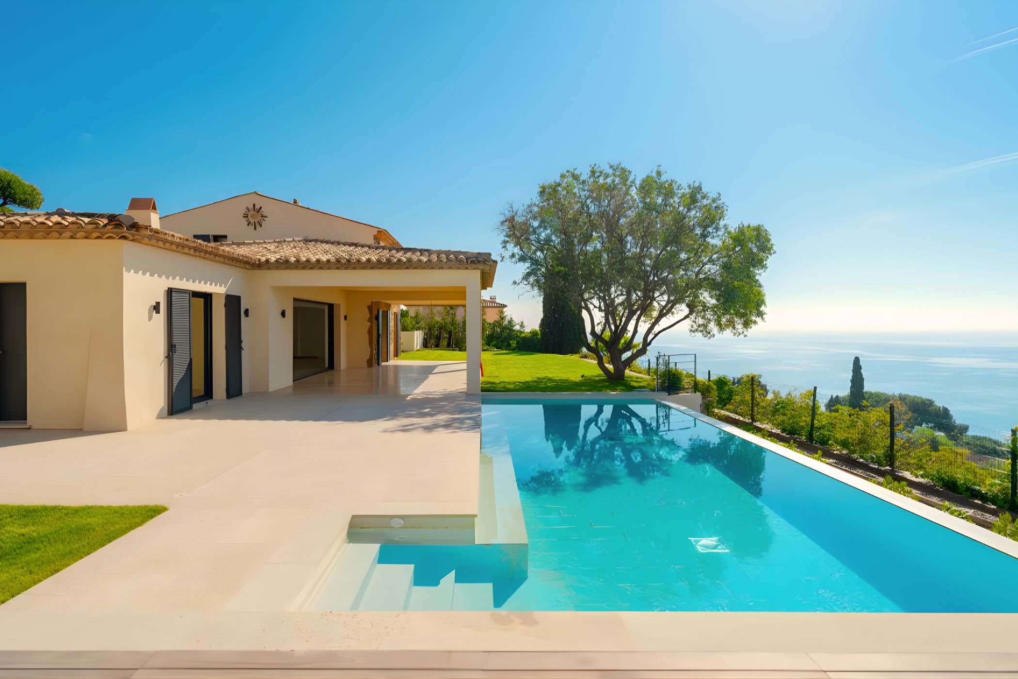 This modern luxury villa is located on a slightly elevated location in Sainte-Maxime and enjoys panoramic views of the sea and the Bay of Saint-Tropez. Surrounded by greenery and nestled in a quiet, well-kept environment, you can enjoy maximum privacy, sunshine and Mediterranean ease – while still being within walking distance of the beach.