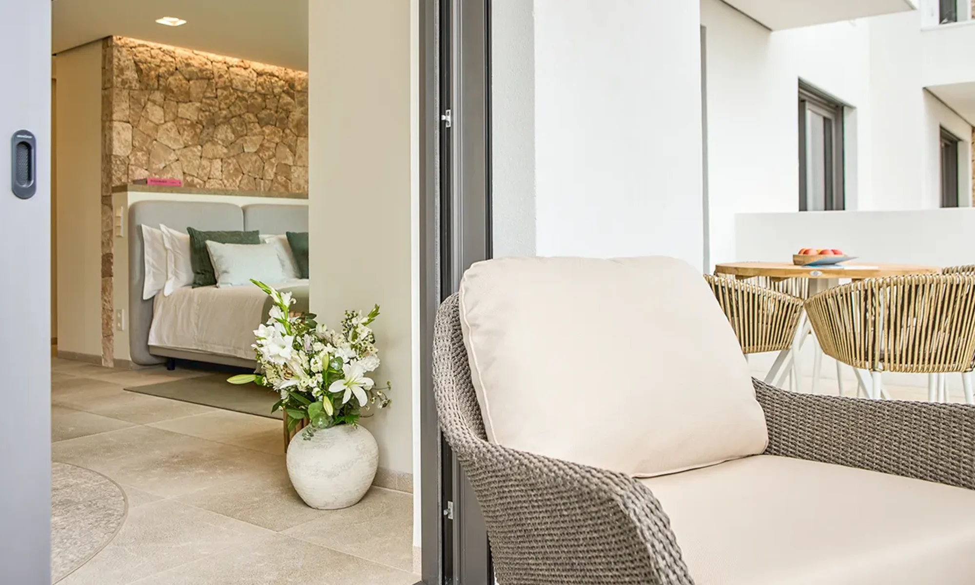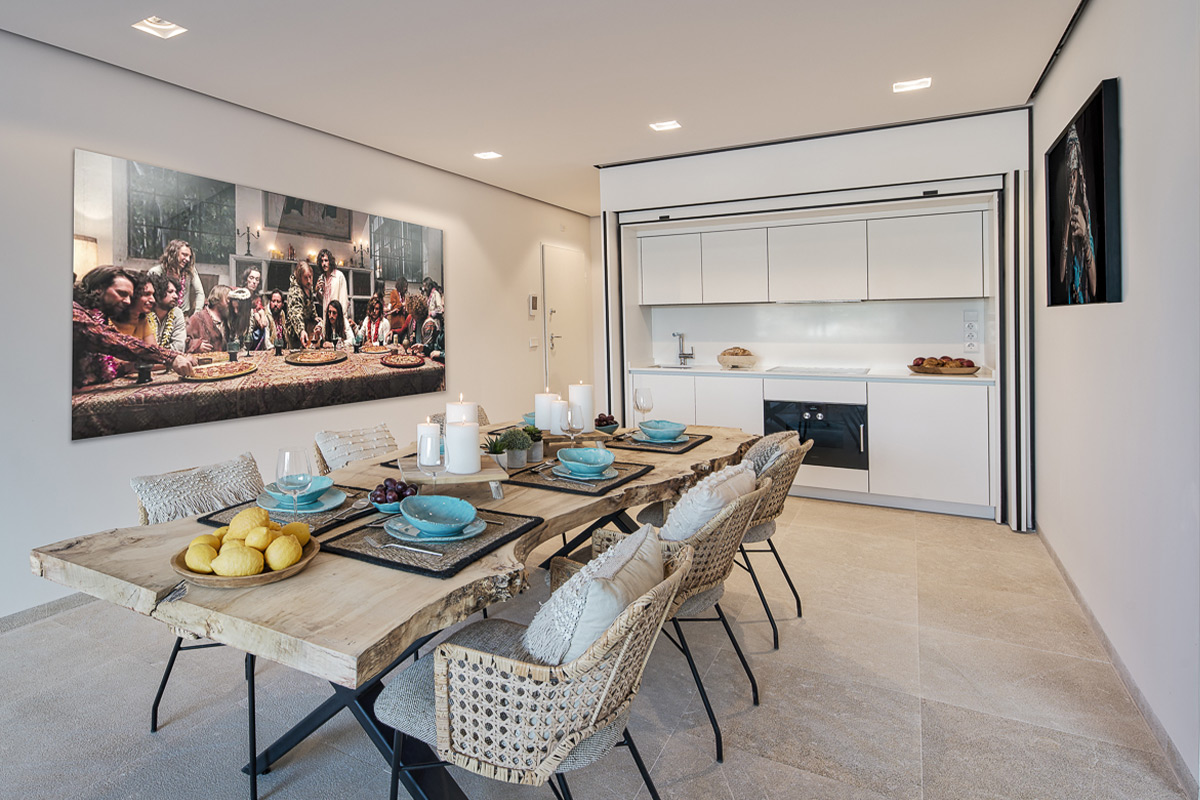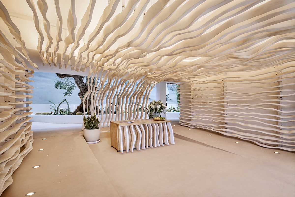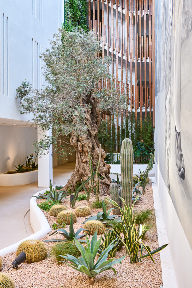 Each apartment bears the name of an icon or landmark from that golden era rather than cold, impersonal numbers, immersing you in a narrative of freedom and artistic expression from the moment you arrive. The architectural vision by i-bau Architects seamlessly blends natural materials—stone, wood, glass—with vertical gardens that breathe life into every corner. At the entrance, a stunning sculptural installation of curved ash wood by StudioSEED welcomes you like a wave frozen in time, setting the tone for the artistic journey ahead. Throughout the property, sculptures and art installations transform everyday spaces into contemplative galleries, while the 15-meter-high central patio floods the interior with natural Mediterranean light and serves as a modern interpretation of the traditional patio.