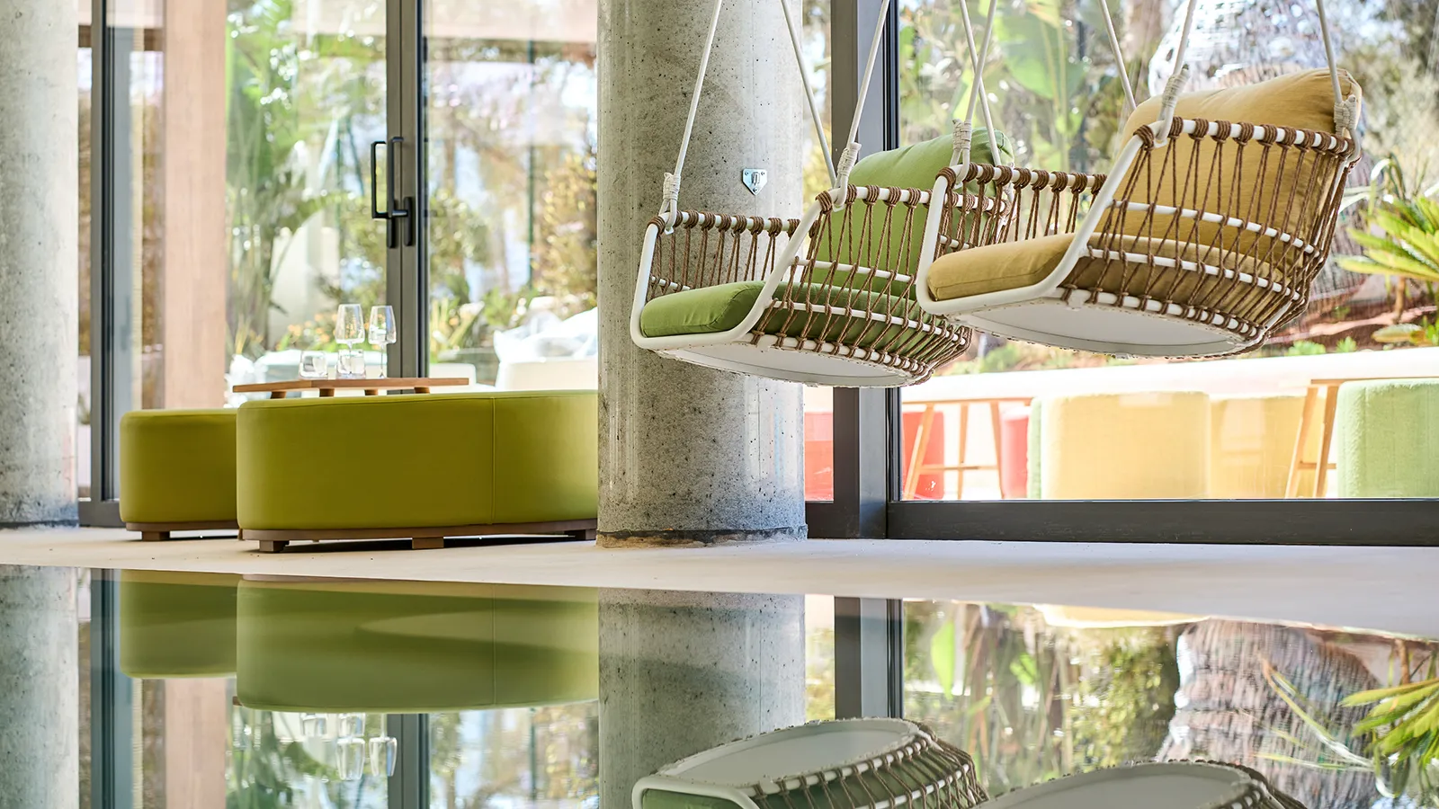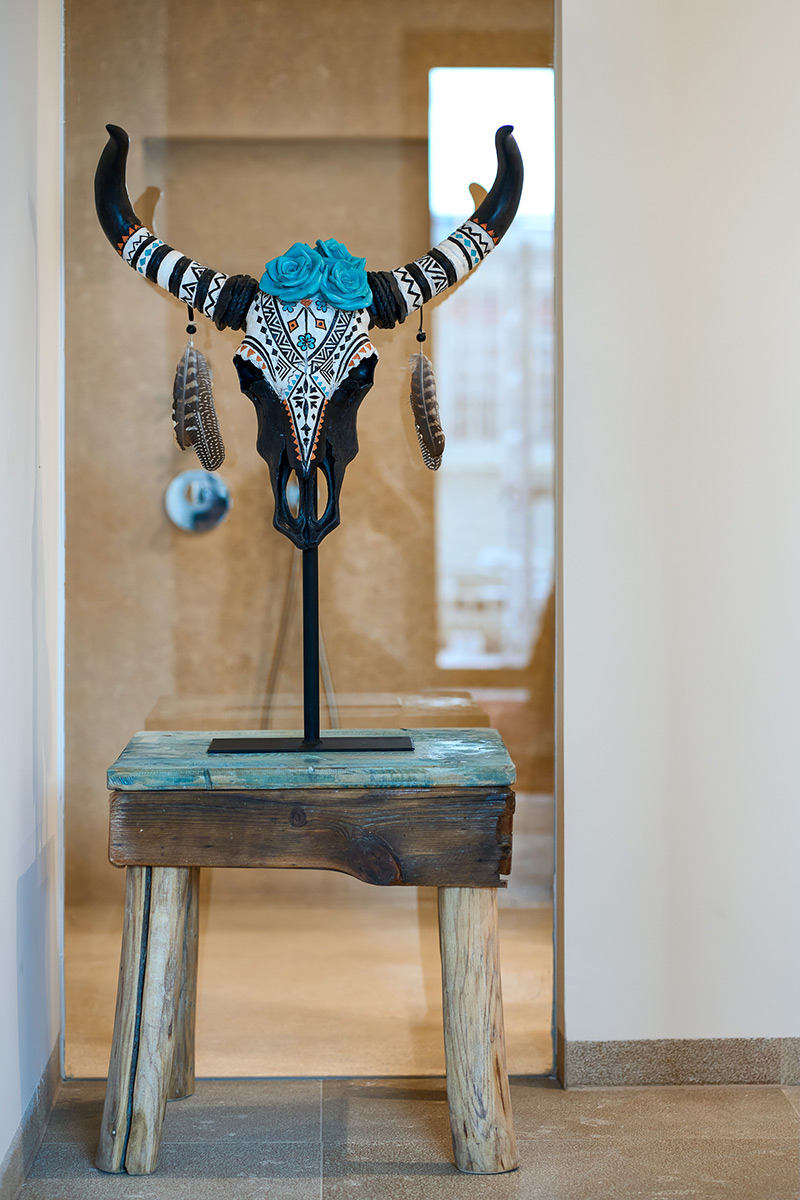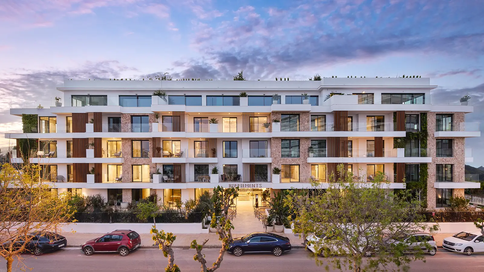 Each apartment bears the name of an icon or landmark from that golden era rather than cold, impersonal numbers, immersing you in a narrative of freedom and artistic expression from the moment you arrive. The architectural vision by i-bau Architects seamlessly blends natural materials—stone, wood, glass—with vertical gardens that breathe life into every corner. At the entrance, a stunning sculptural installation of curved ash wood by StudioSEED welcomes you like a wave frozen in time, setting the tone for the artistic journey ahead. Throughout the property, sculptures and art installations transform everyday spaces into contemplative galleries, while the 15-meter-high central patio floods the interior with natural Mediterranean light and serves as a modern interpretation of the traditional patio.
